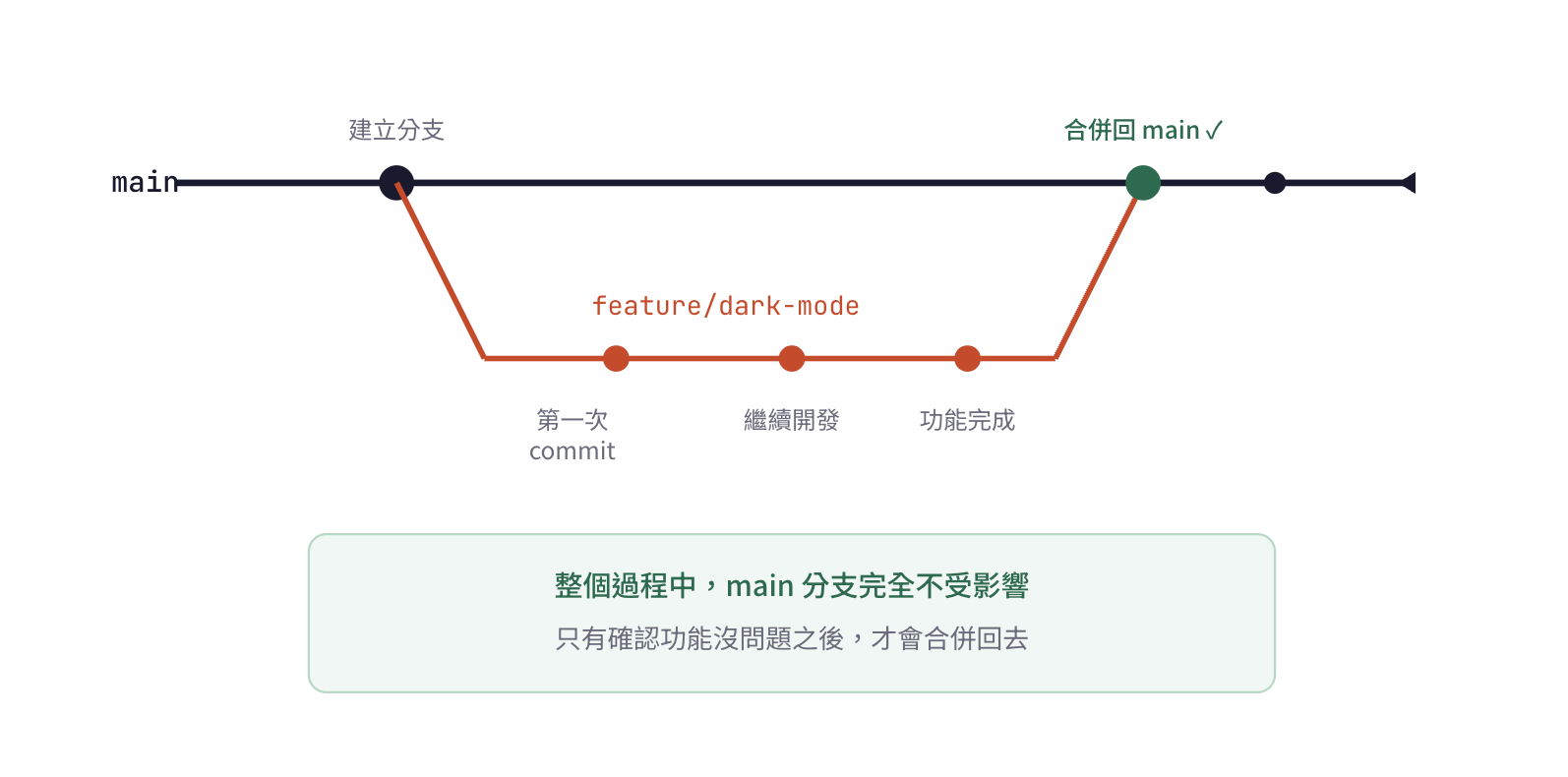 這樣一來,就能放心地在分支上大膽嘗試各種想法,不用擔心會影響到 main 上已經穩定的成果。