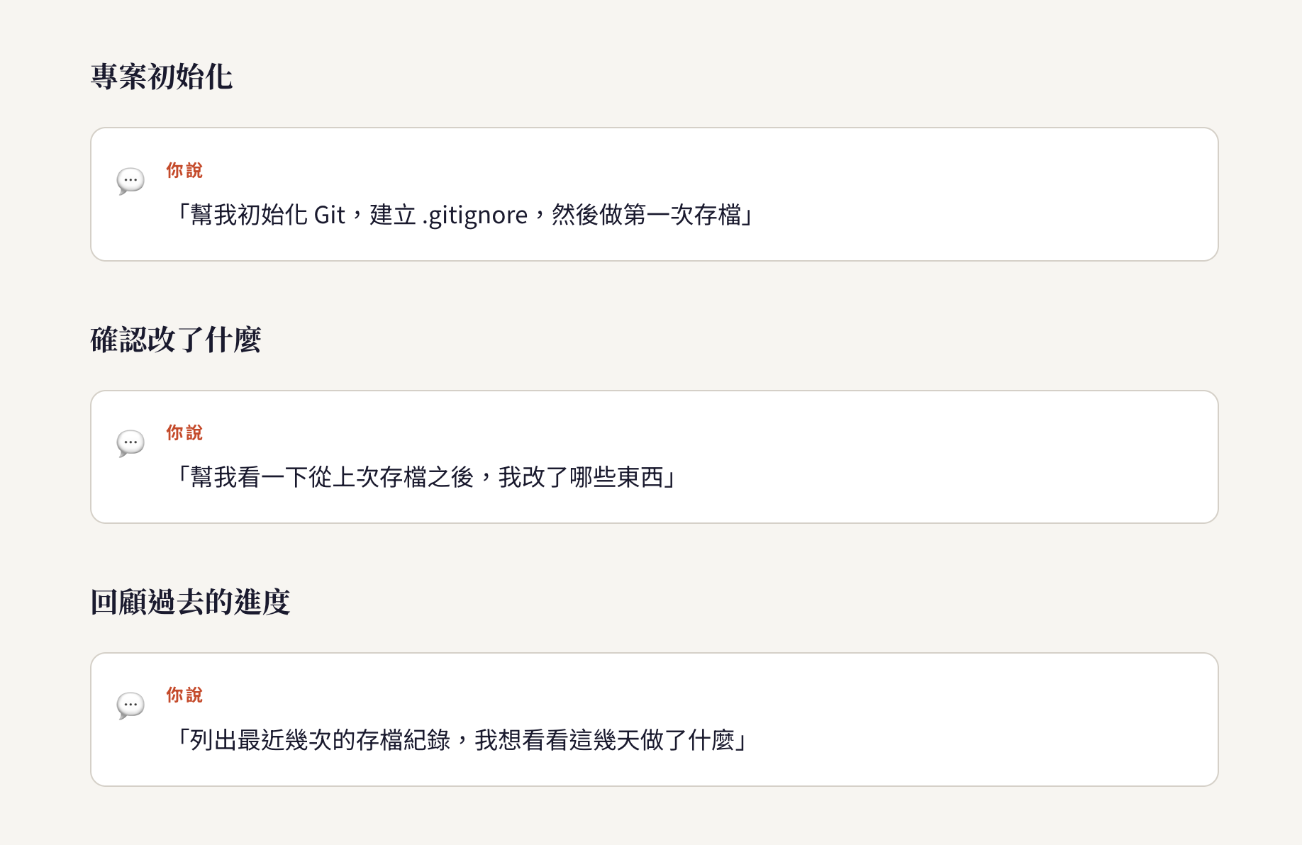 對 Vibe Coder 來說,學 Git 最大的好處是:你可以放心地讓 Claude Code 去嘗試各種改動,因為你知道任何時候都能「倒帶」回安全的版本。