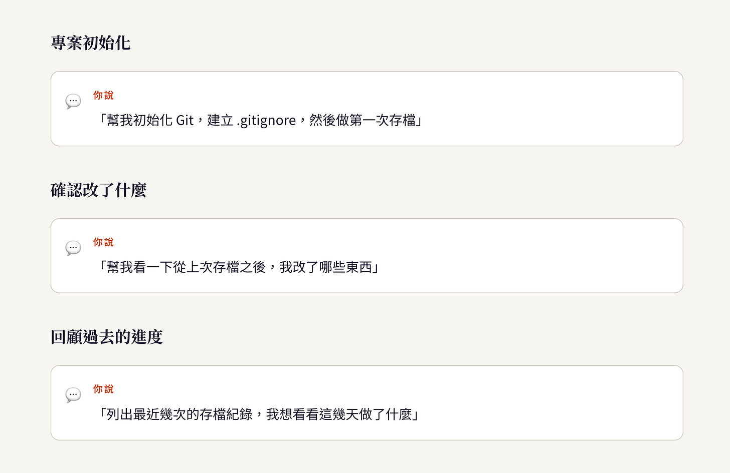 特別是搭配 Claude Code 後,可以不需要硬記要打什麼指令,只要像對話一般來這樣說:「幫我儲存一下現在的進度」、「開一條新分支來寫這個功能」,Claude Code 就能輕鬆搞定。