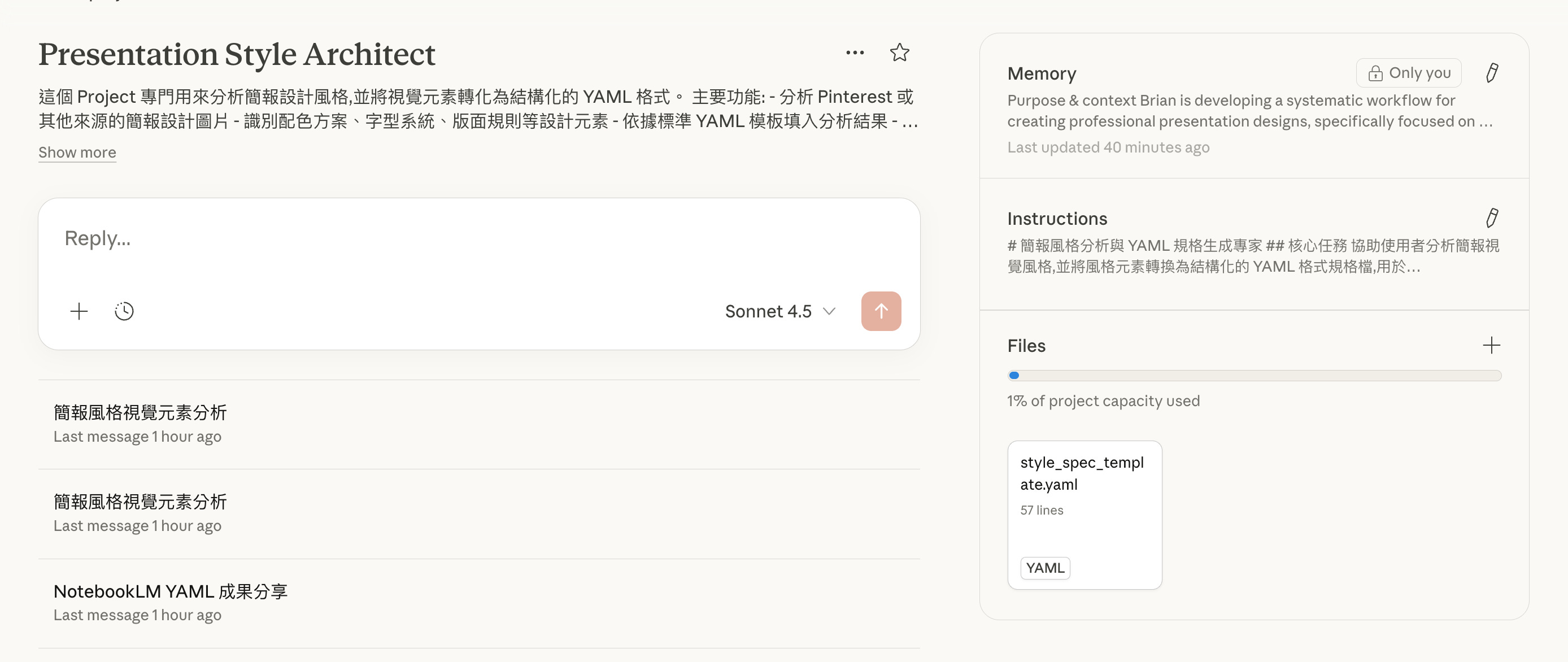 當 AI 分析完參考圖的風格元素後,你會來回跟 AI 討論想要的感覺是什麼。這時,討論內容串可能會很長,但你不用一個個去對格式來填入 YAML——請 Claude Project 幫你整理就好。