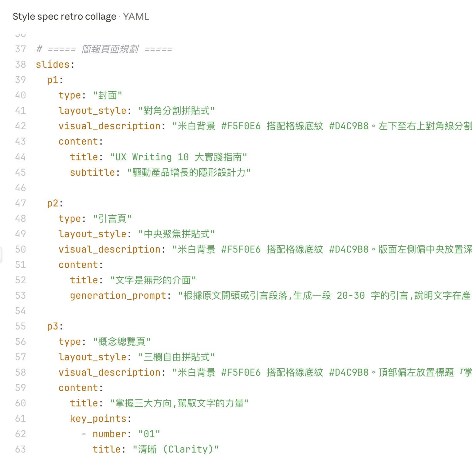 規劃好內容後,不用自己一頁頁想排版——AI 會根據風格為每一頁設計佈局。等 YAML 生成好後,再做調整就好囉。